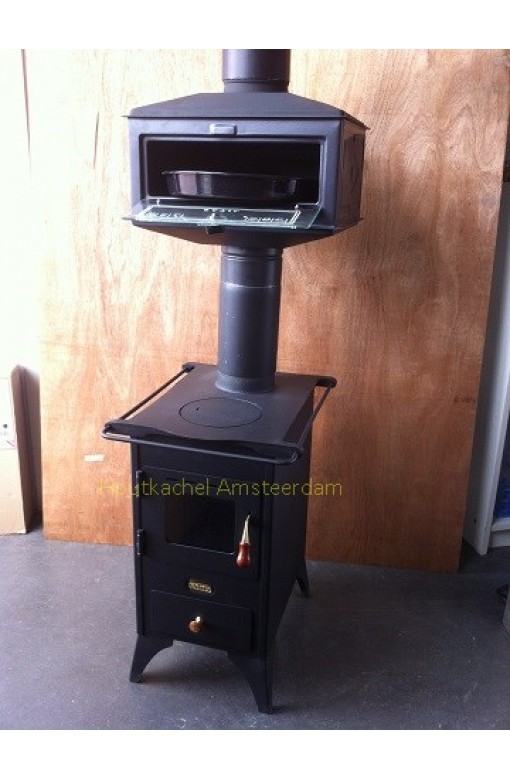 Op de voorbeeldfoto ziet u de opzet-oven met dikwandige kachelpijpen op een Prity Mini houtkachel.