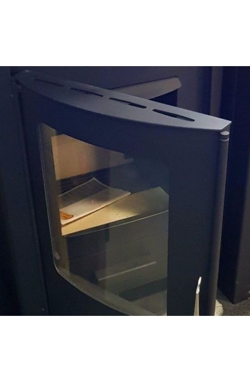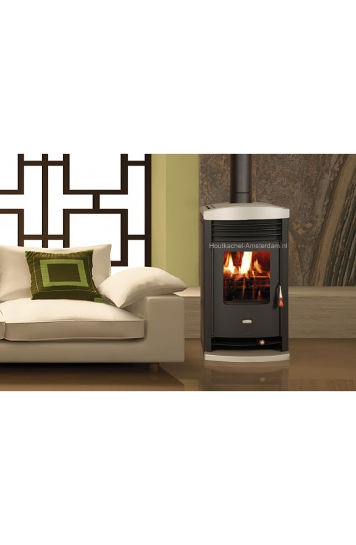De Prity SK is een strak uitziende CV-houtkachel met karakteristieke gebogen voor- en bovenkant. De aslade bevindt zich verborgen achter de deur met venster.