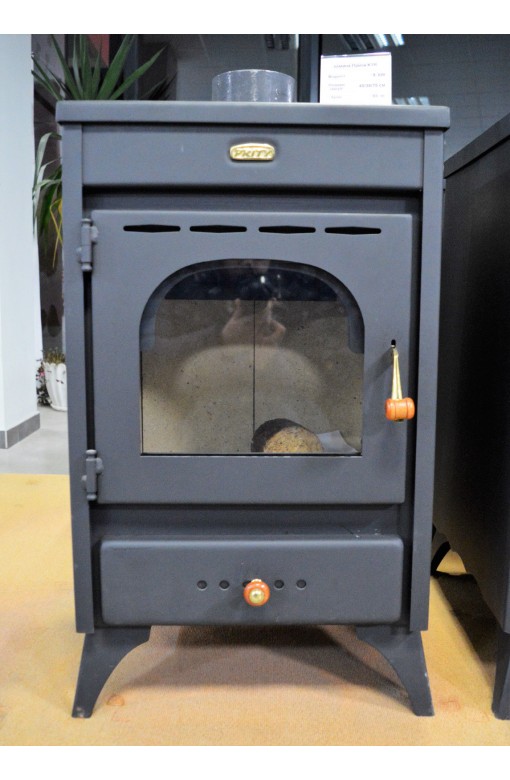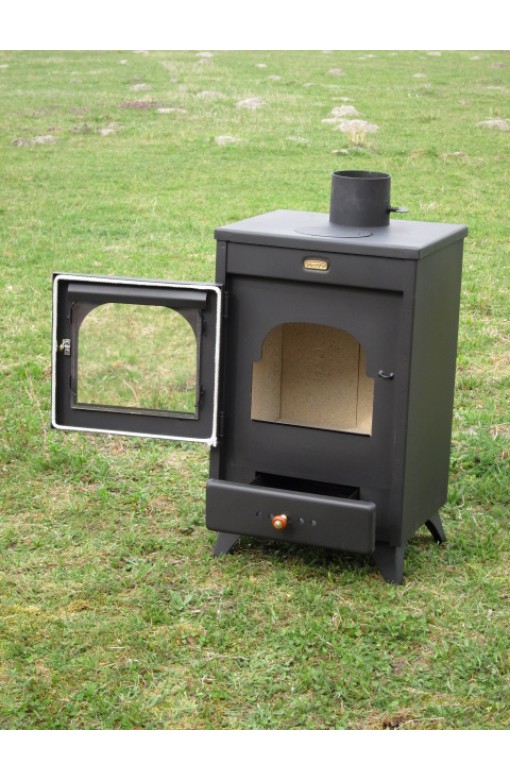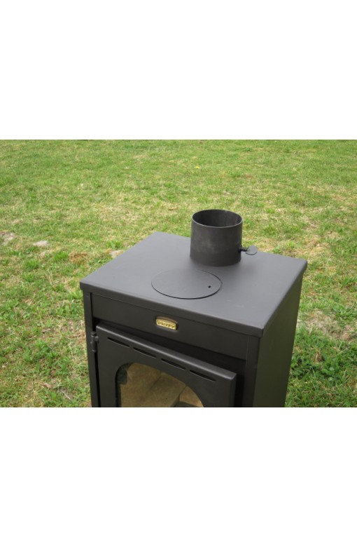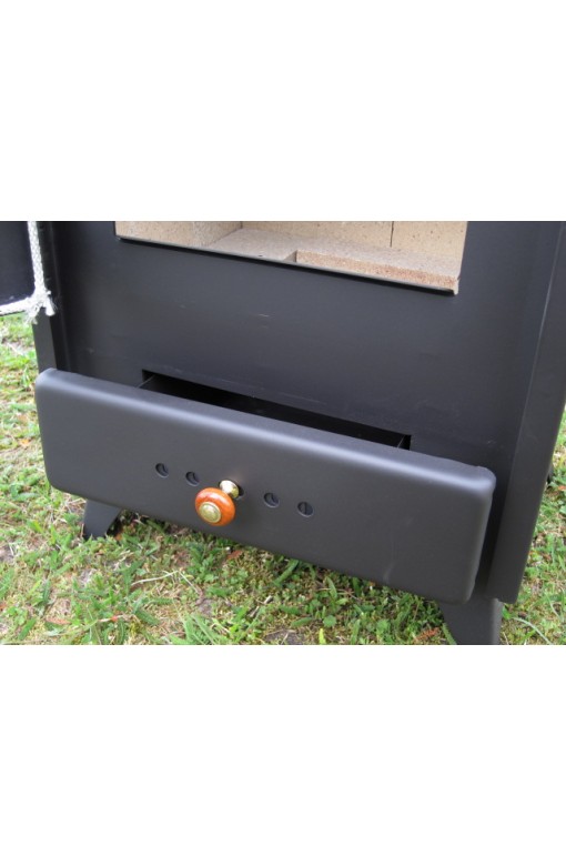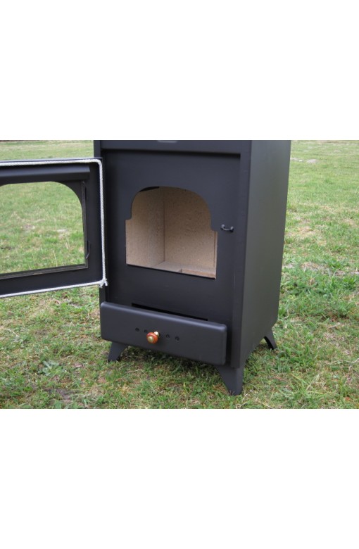 - Materiaal: plaatstaal, binnenwandbekleding chamotte steen, hittebestendig glas, vuurrooster en bovenkant met kookplaatje van gietijzer