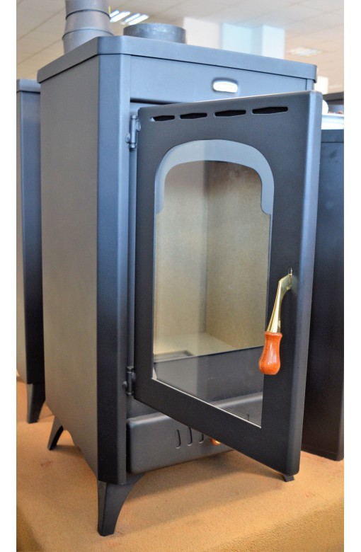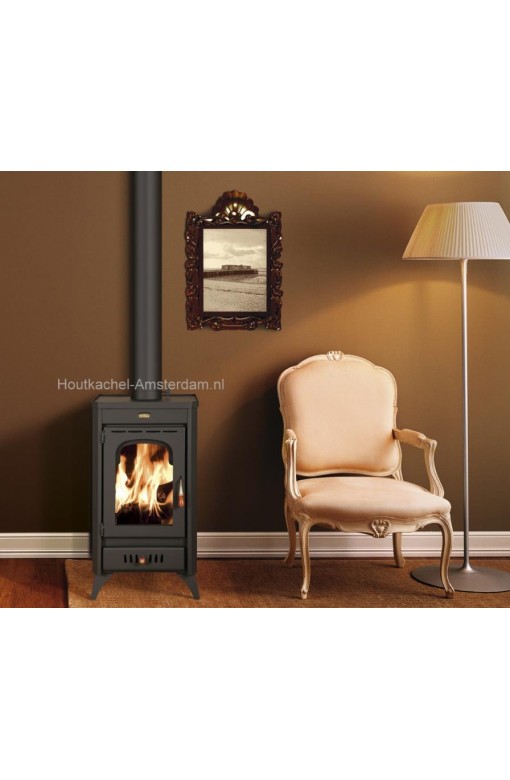 Een zeer stijlvolle houtkachel. Een wat hoger model op stevige pootjes.